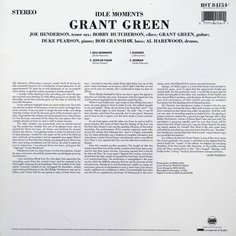 Idle Moments, aufgenommen im November 1963, war für Grant Green bereits die achte Aufnahme als Leader für Blue Note innerhalb eines Zeitraumes von ungefähr zweieinhalb Jahren. Sie müssen ihn dort wirklich gemocht haben: Rechnet man seine Jobs als Sideman dazu, dann hatte er seit seinem Debüt an die dreißig Sessions für das Label gespielt. Einer der Gründe dafür mag seine stilistische Vielseitigkeit gewesen sein: Unter seinen eigenen Aufnahmen finden sich Orgel-Trios (Grant’s First Stand), Hard-Bop-Quartette (Grantstand) und -Quintette (Am I Blue), Gospel (Feelin’ The Spirit) und Latin-Jazz (The Latin Bit). Keine dieser Platten wurde ein Klassiker, obwohl sie immer wieder mal aufgelegt wurden und meistens in irgendeiner Form zu haben waren, ob auf CD oder Vinyl.